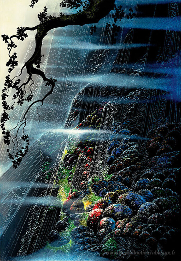 Nous vous proposons une reproduction artisanale sur toile du célèbre tableau 'Magie du soir' de Eyvind Earle, provenant du Musée de la Reproduction.
