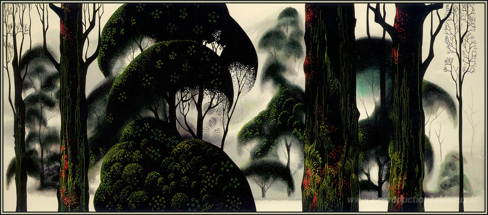 Nous vous proposons une reproduction artisanale sur toile du célèbre tableau 'Magie forestière' de Eyvind Earle, provenant du Musée de la Reproduction.