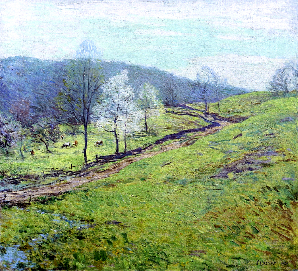 Nous vous proposons une reproduction artisanale sur toile du célèbre tableau 'Mai après-midi' de Willard Metcalf, provenant du Musée de la Reproduction.