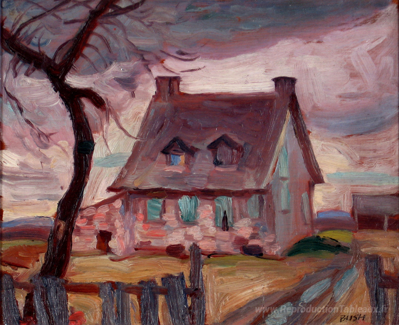 Nous vous proposons une reproduction artisanale sur toile du célèbre tableau 'Maison de ferme française, Montréal' de Jack Bush, provenant du Musée de la Reproduction.