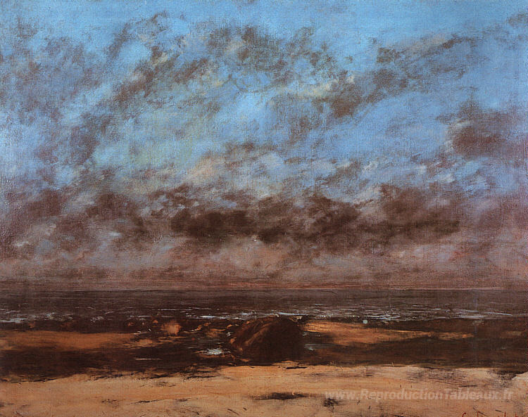 Nous vous proposons une reproduction artisanale sur toile du célèbre tableau 'Marée basse' de Gustave Courbet, provenant du Musée de la Reproduction.