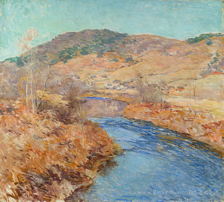 Nous vous proposons une reproduction artisanale sur toile du célèbre tableau 'Matin de novembre' de Willard Metcalf, provenant du Musée de la Reproduction.