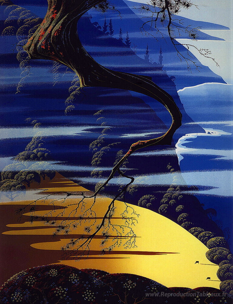 Nous vous proposons une reproduction artisanale sur toile du célèbre tableau 'Mer, falaise et pin' de Eyvind Earle, provenant du Musée de la Reproduction.