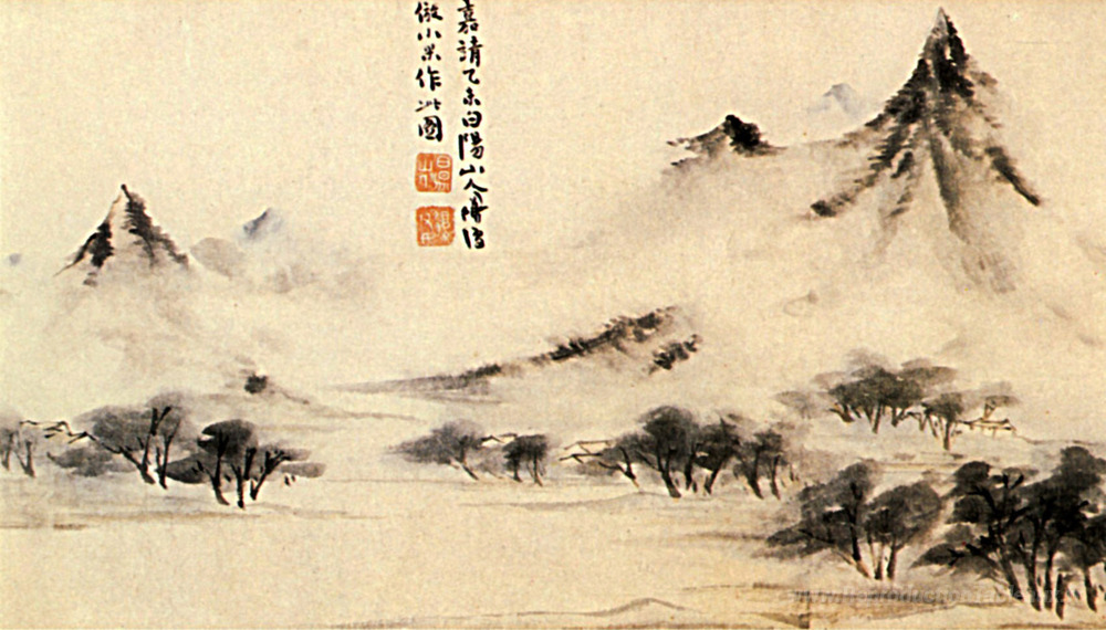 Nous vous proposons une reproduction artisanale sur toile du célèbre tableau 'Mistes sur la montagne' de Shitao, provenant du Musée de la Reproduction.