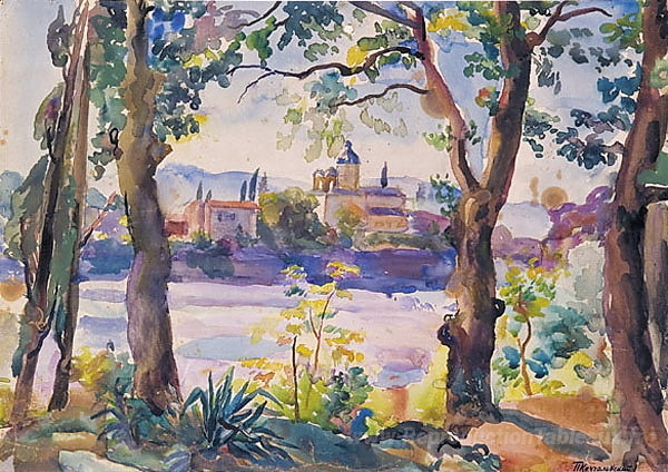 Nous vous proposons une reproduction artisanale sur toile du célèbre tableau 'Monastère au loin' de Pyotr Konchalovsky, provenant du Musée de la Reproduction.