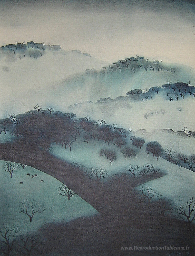 Nous vous proposons une reproduction artisanale sur toile du célèbre tableau 'Montagnes brumeuses' de Eyvind Earle, provenant du Musée de la Reproduction.
