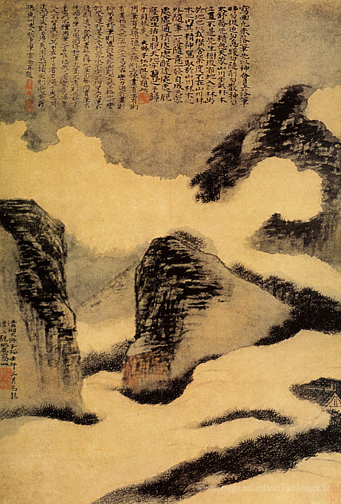 Nous vous proposons une reproduction artisanale sur toile du célèbre tableau 'Montagnes dans la brume' de Shitao, provenant du Musée de la Reproduction.