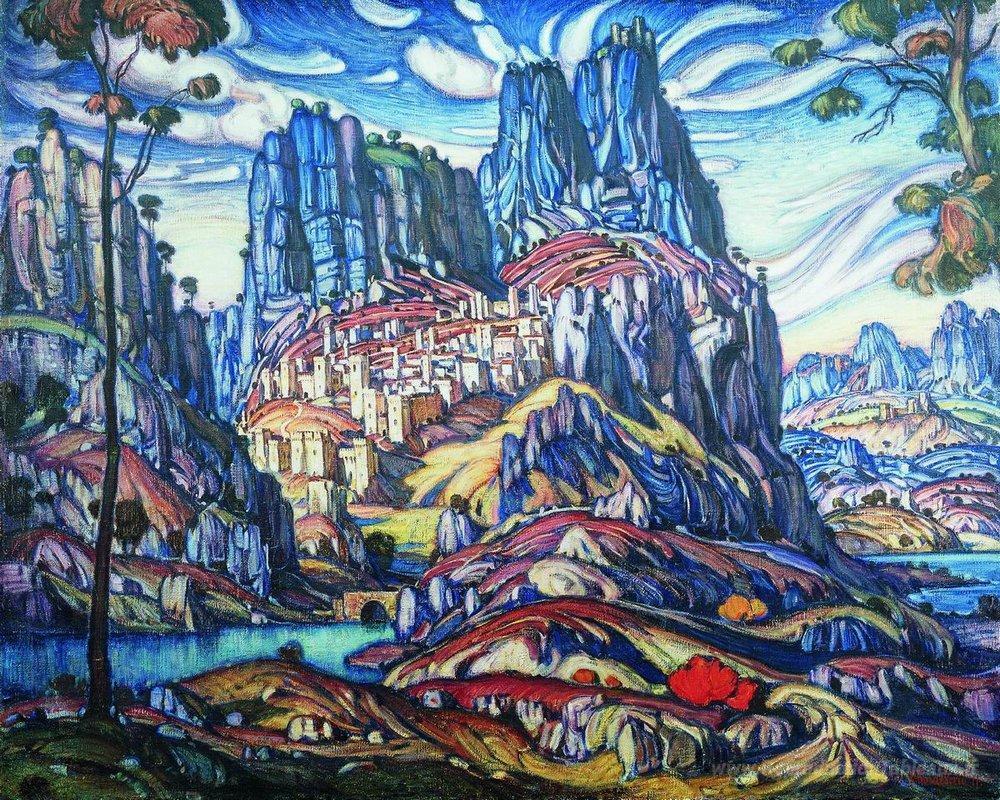 Nous vous proposons une reproduction artisanale sur toile du célèbre tableau 'Monte San Giorgio' de Konstantin Bogaevsky, provenant du Musée de la Reproduction.