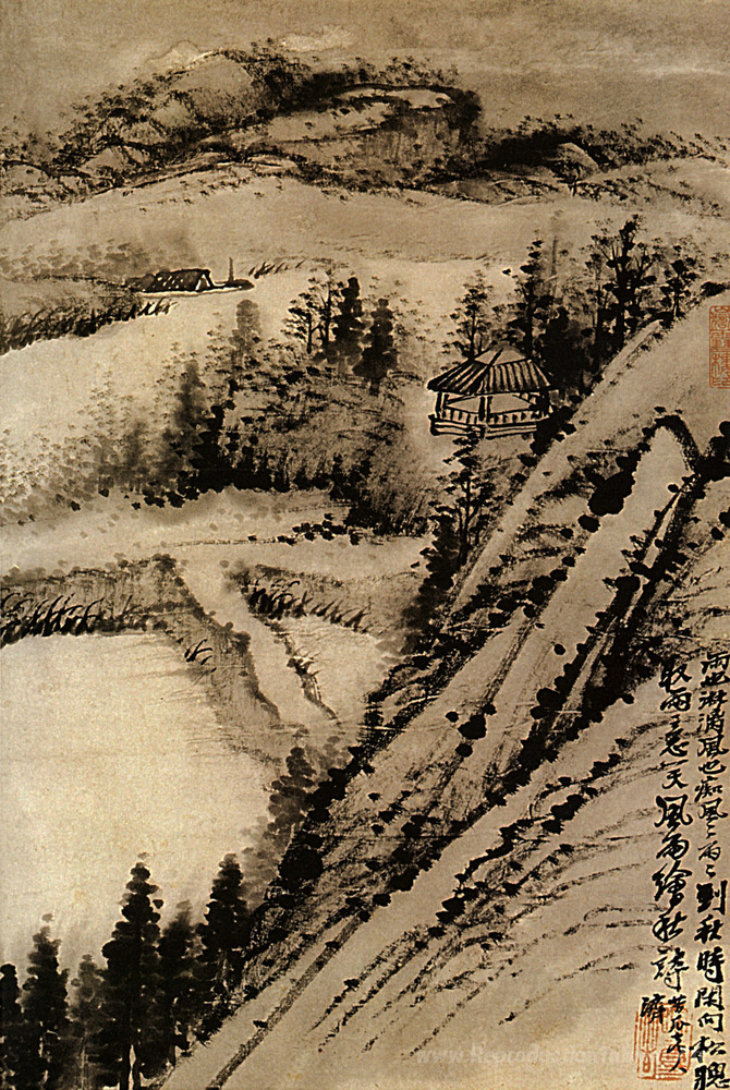 Nous vous proposons une reproduction artisanale sur toile du célèbre tableau 'Montez un plan de plus' de Shitao, provenant du Musée de la Reproduction.