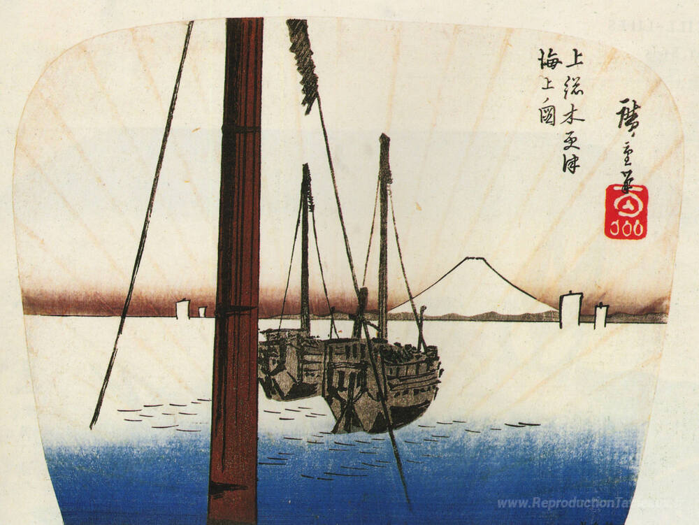 Nous vous proposons une reproduction artisanale sur toile du célèbre tableau 'Mount Fuji vu à travers l'eau' de Hiroshige, provenant du Musée de la Reproduction.