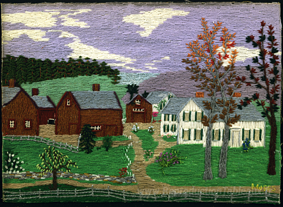 Nous vous proposons une reproduction artisanale sur toile du célèbre tableau 'Mt. Nebo sur la colline' de Grandma Moses, provenant du Musée de la Reproduction.
