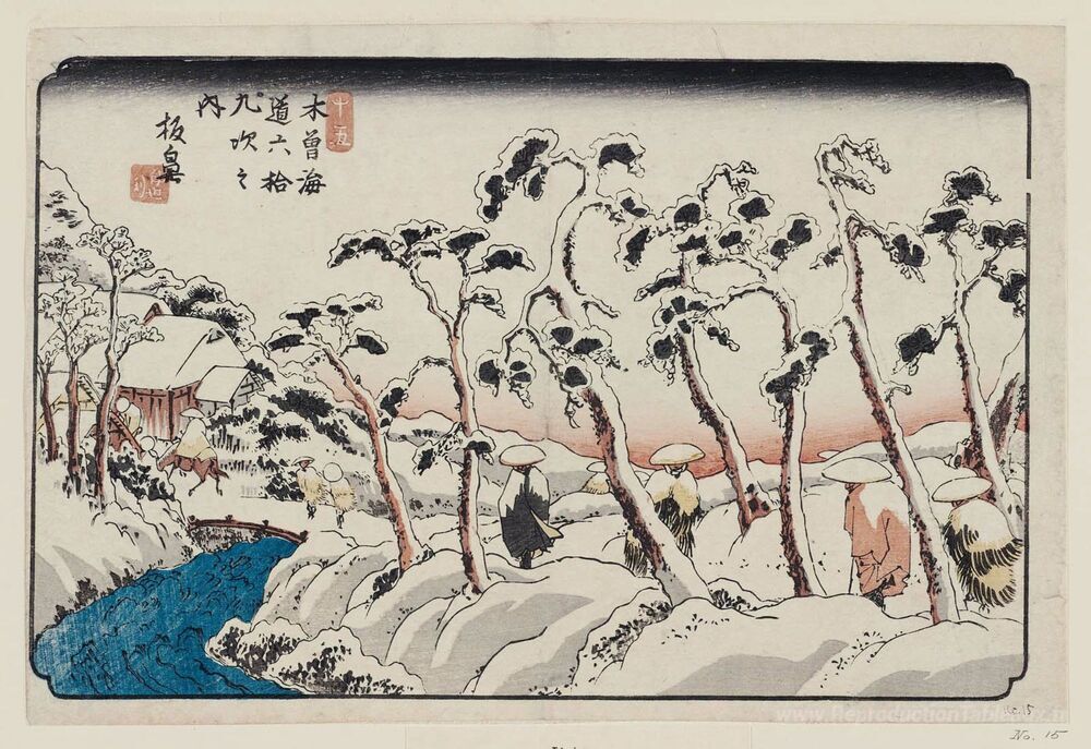 Nous vous proposons une reproduction artisanale sur toile du célèbre tableau 'N ° 15, Itahana, de la série les soixante-neuf stations de la ro' de Keisai Eisen, provenant du Musée de la Reproduction.