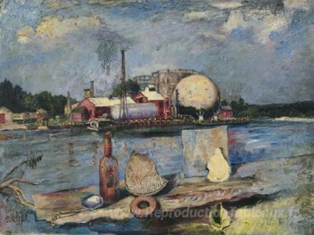 Nous vous proposons une reproduction artisanale sur toile du célèbre tableau 'Nature morte avec l'industrie' de David Burliuk, provenant du Musée de la Reproduction.