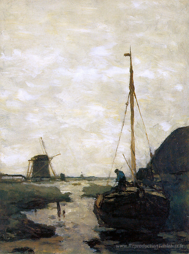 Nous vous proposons une reproduction artisanale sur toile du célèbre tableau 'Navire à Polder Canal' de Johan Hendrik Weissenbruch, provenant du Musée de la Reproduction.