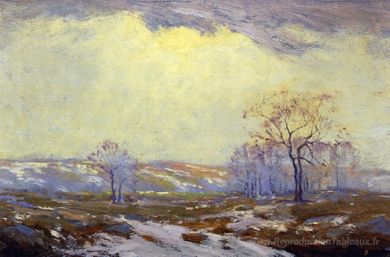 Nous vous proposons une reproduction artisanale sur toile du célèbre tableau 'Neige persistante' de Robert Julian Onderdonk, provenant du Musée de la Reproduction.