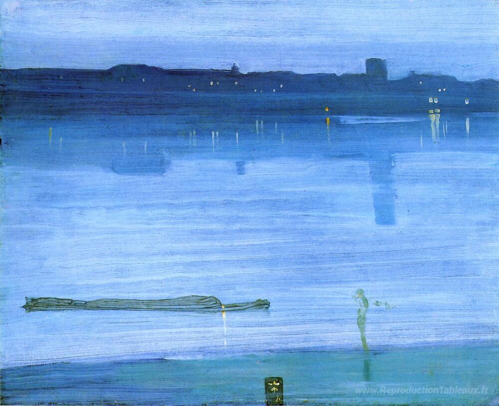 Nous vous proposons une reproduction artisanale sur toile du célèbre tableau 'Nocturne, bleu et argent: Chelsea' de James McNeill Whistler, provenant du Musée de la Reproduction.