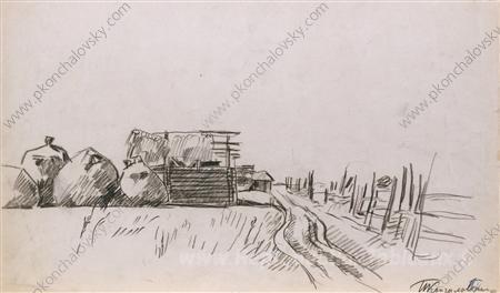 Nous vous proposons une reproduction artisanale sur toile du célèbre tableau 'Novgorod. Granges.' de Pyotr Konchalovsky, provenant du Musée de la Reproduction.