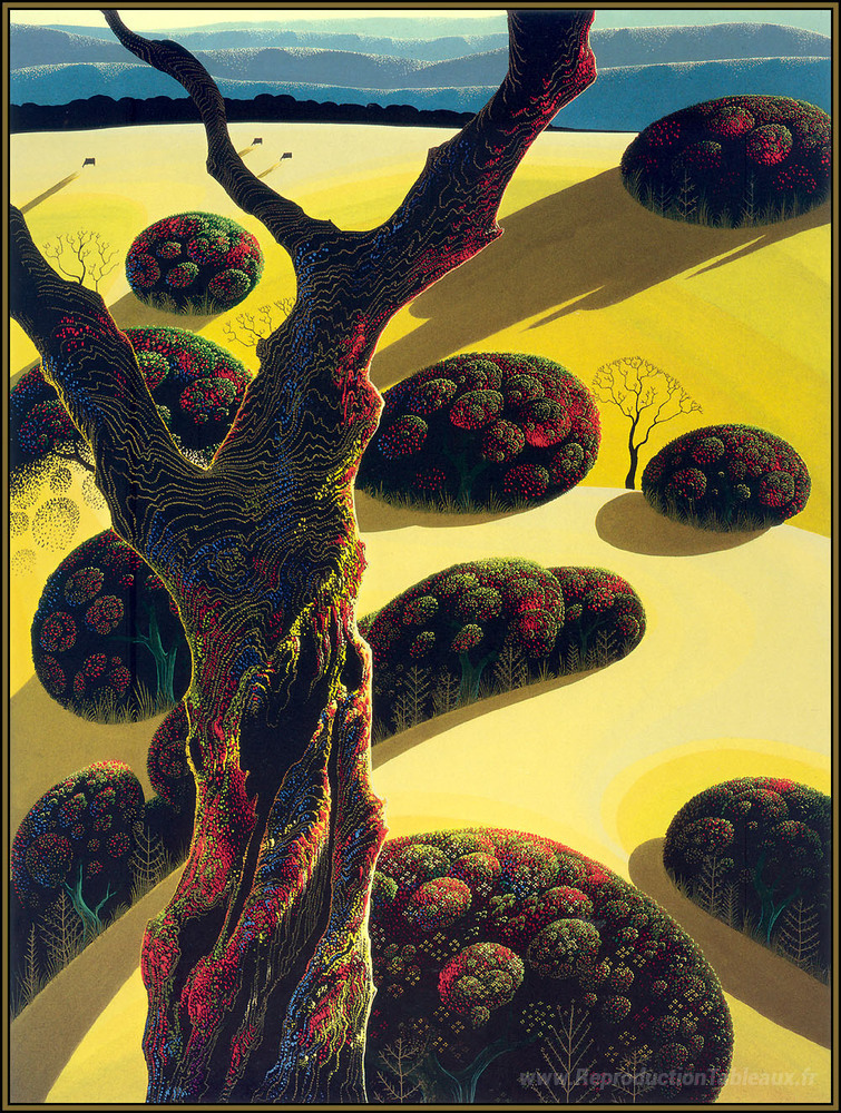 Nous vous proposons une reproduction artisanale sur toile du célèbre tableau 'Oaks en direct' de Eyvind Earle, provenant du Musée de la Reproduction.