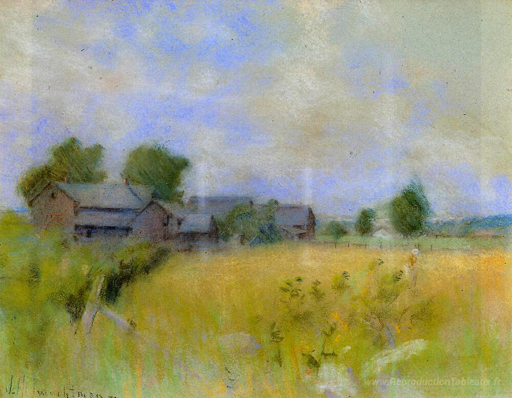 Nous vous proposons une reproduction artisanale sur toile du célèbre tableau 'Pâturage avec granges, cos tob' de John Henry Twachtman, provenant du Musée de la Reproduction.