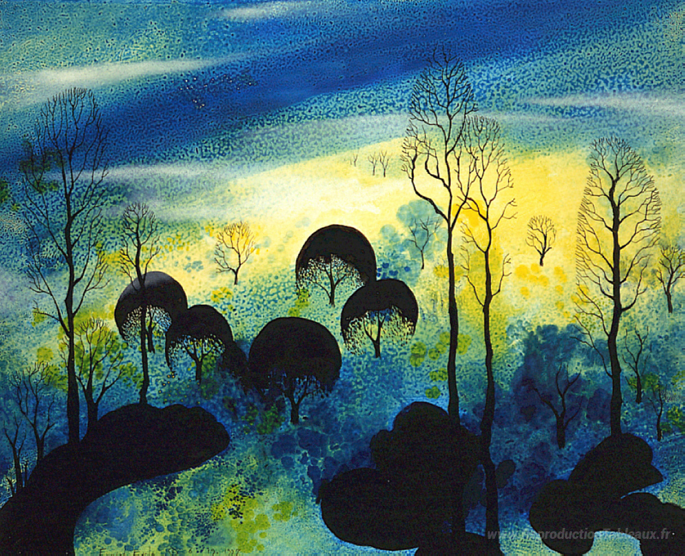 Nous vous proposons une reproduction artisanale sur toile du célèbre tableau 'Pâturages à travers le brouillard' de Eyvind Earle, provenant du Musée de la Reproduction.