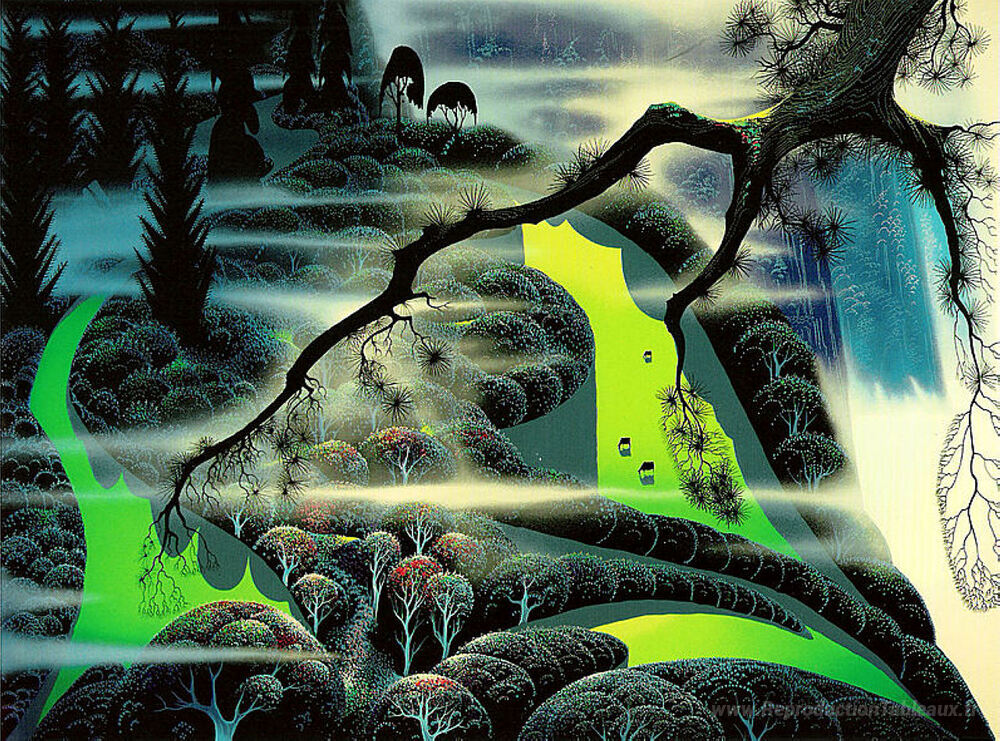 Nous vous proposons une reproduction artisanale sur toile du célèbre tableau 'Pâturages verts' de Eyvind Earle, provenant du Musée de la Reproduction.