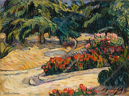Nous vous proposons une reproduction artisanale sur toile du célèbre tableau 'Palmiers et géranium' de Pyotr Konchalovsky, provenant du Musée de la Reproduction.