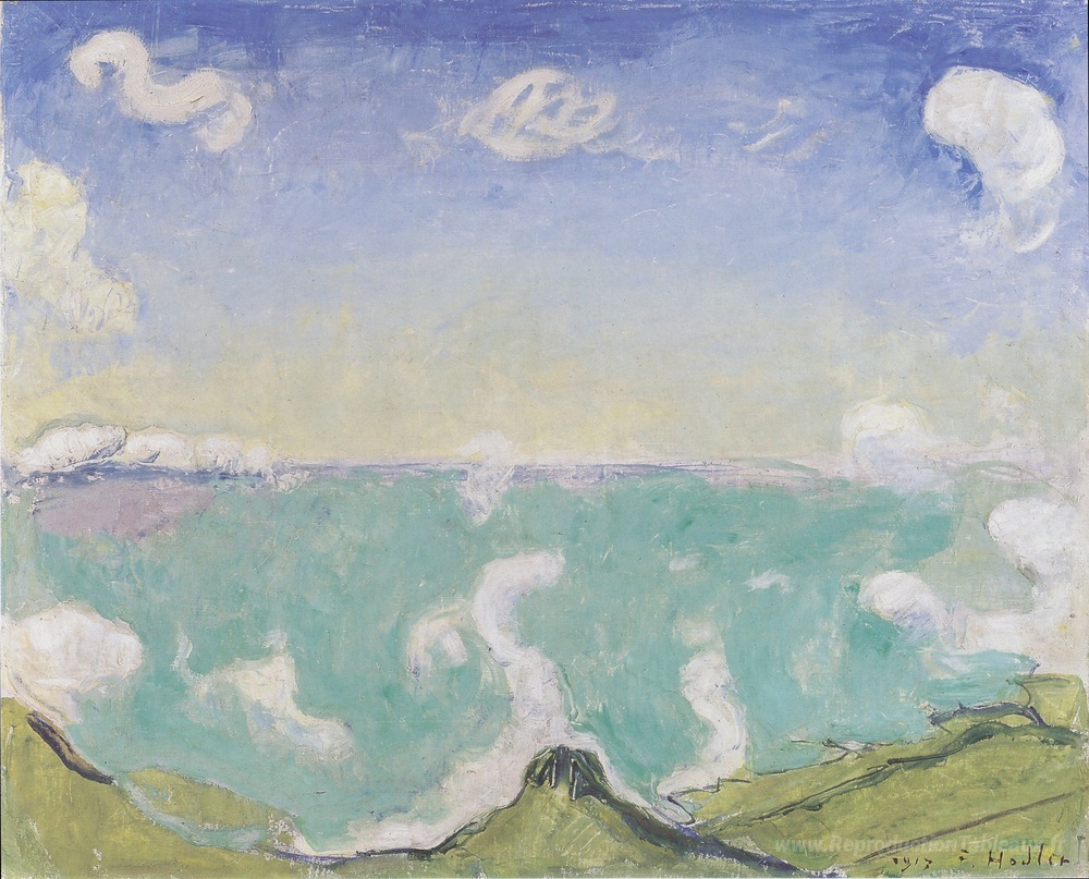 Nous vous proposons une reproduction artisanale sur toile du célèbre tableau 'Paysage à Caux avec des nuages croissants' de Ferdinand Hodler, provenant du Musée de la Reproduction.
