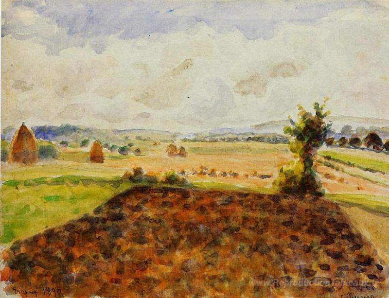 Nous vous proposons une reproduction artisanale sur toile du célèbre tableau 'Paysage à Eragny, temps clair' de Camille Pissarro, provenant du Musée de la Reproduction.