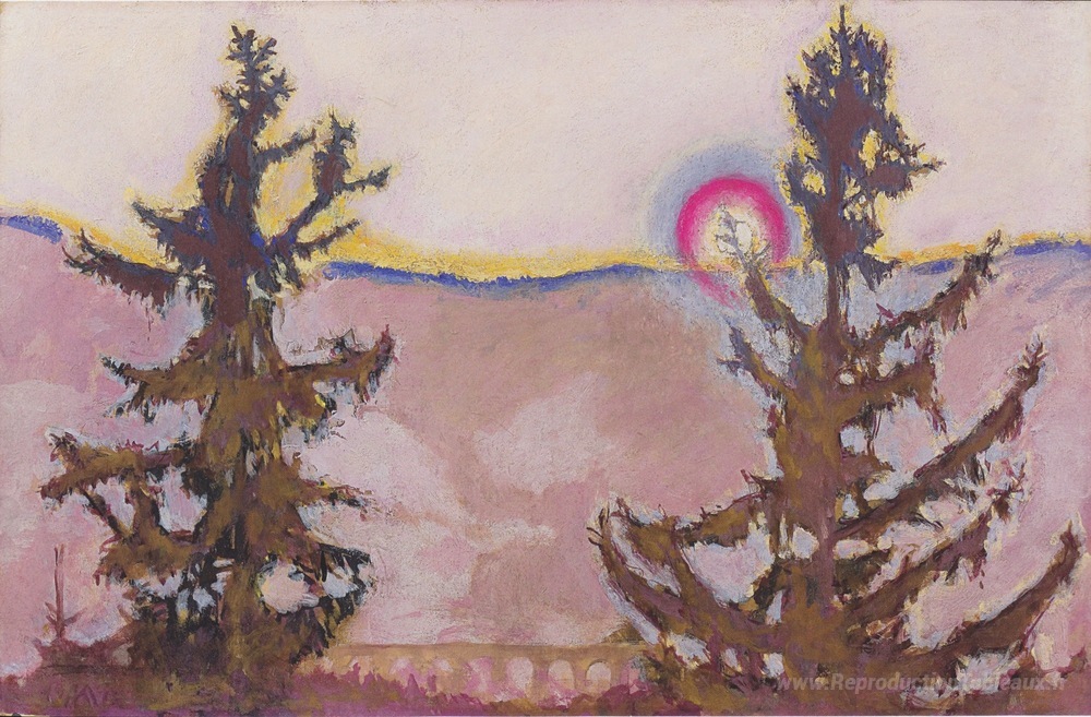 Nous vous proposons une reproduction artisanale sur toile du célèbre tableau 'Paysage à Semmering' de Koloman Moser, provenant du Musée de la Reproduction.