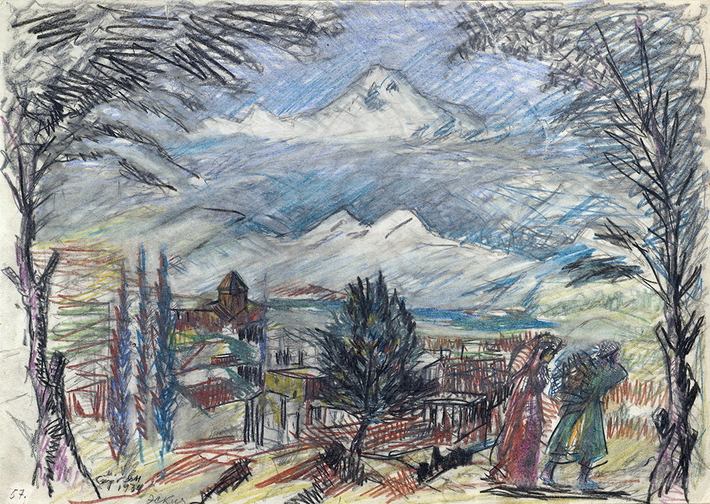 Nous vous proposons une reproduction artisanale sur toile du célèbre tableau 'Paysage arménien' de Martiros Saryan, provenant du Musée de la Reproduction.