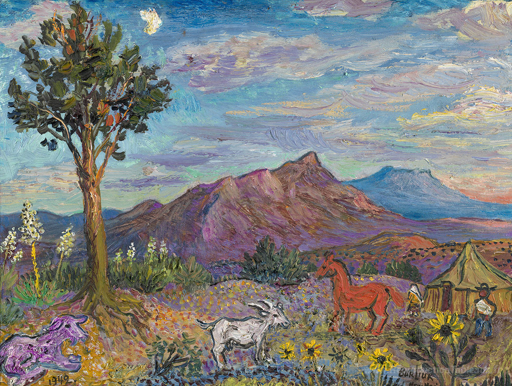 Nous vous proposons une reproduction artisanale sur toile du célèbre tableau 'Paysage au Nouveau-Mexique' de David Burliuk, provenant du Musée de la Reproduction.