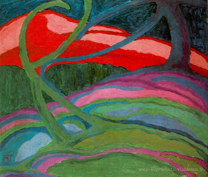 Nous vous proposons une reproduction artisanale sur toile du célèbre tableau 'Paysage aux couleurs sombres (arbres)' de Janos Mattis-Teutsch, provenant du Musée de la Reproduction.