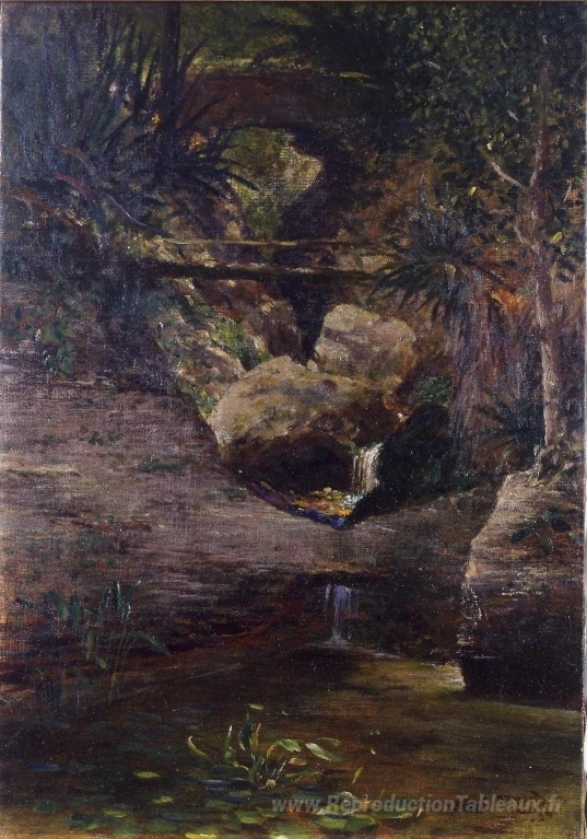 Nous vous proposons une reproduction artisanale sur toile du célèbre tableau 'Paysage avec cascade' de Louis Comfort Tiffany, provenant du Musée de la Reproduction.