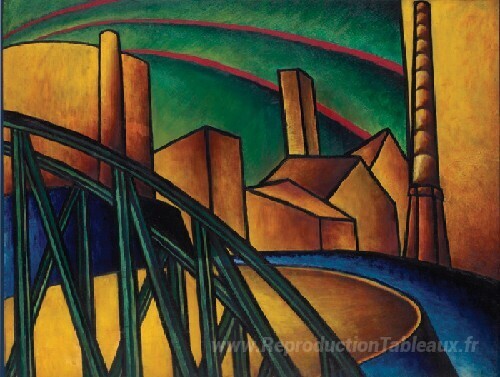 Nous vous proposons une reproduction artisanale sur toile du célèbre tableau 'Paysage avec pont à Óbuda Hajógyár' de Laszlo Moholy-Nagy, provenant du Musée de la Reproduction.