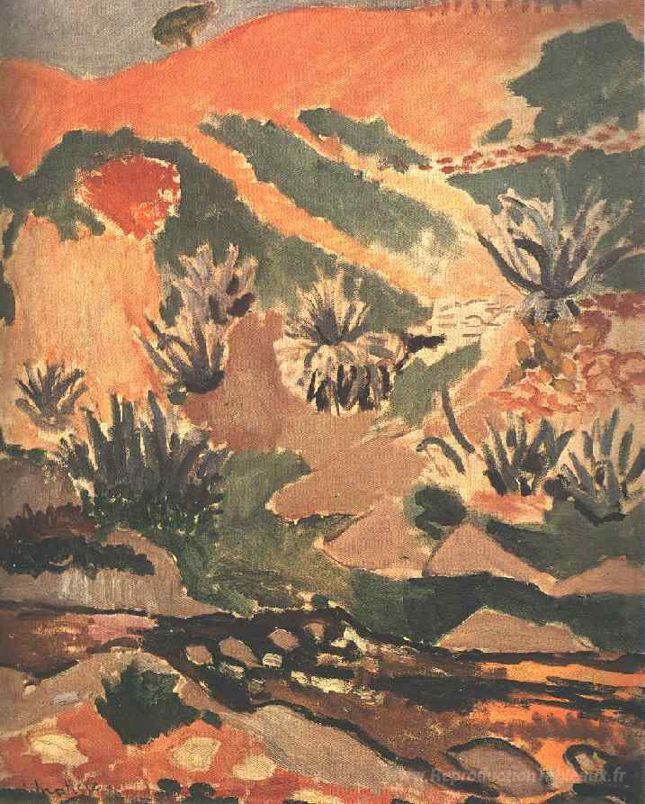 Nous vous proposons une reproduction artisanale sur toile du célèbre tableau 'Paysage avec ruisseau (ruisseau avec aloes)' de Henri Matisse, provenant du Musée de la Reproduction.