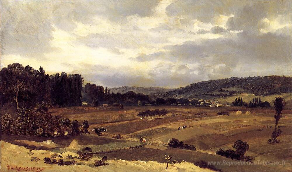 Nous vous proposons une reproduction artisanale sur toile du célèbre tableau 'Paysage avec terres agricoles' de Theodore Rousseau, provenant du Musée de la Reproduction.