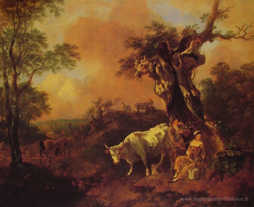Nous vous proposons une reproduction artisanale sur toile du célèbre tableau 'Paysage avec un bûcheron et une laitière' de Thomas Gainsborough, provenant du Musée de la Reproduction.