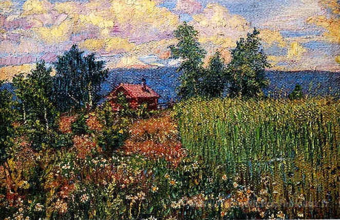 Nous vous proposons une reproduction artisanale sur toile du célèbre tableau 'Paysage avec une maison rose' de David Burliuk, provenant du Musée de la Reproduction.