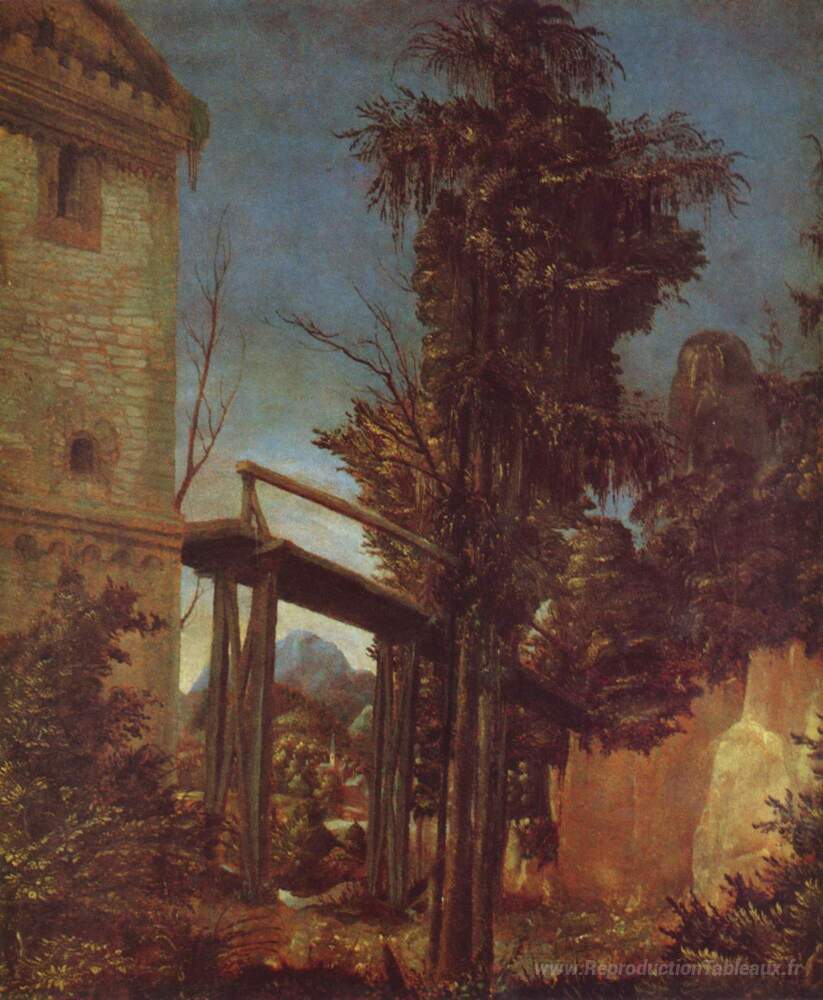 Nous vous proposons une reproduction artisanale sur toile du célèbre tableau 'Paysage avec une passerelle' de Albrecht Altdorfer, provenant du Musée de la Reproduction.
