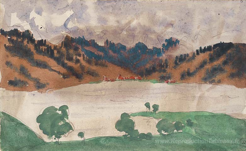 Nous vous proposons une reproduction artisanale sur toile du célèbre tableau 'Paysage avec une rivière (Norvège entre Bergen et Christiensia)' de Anna Ostroumova-Lebedeva, provenant du Musée de la Reproduction.