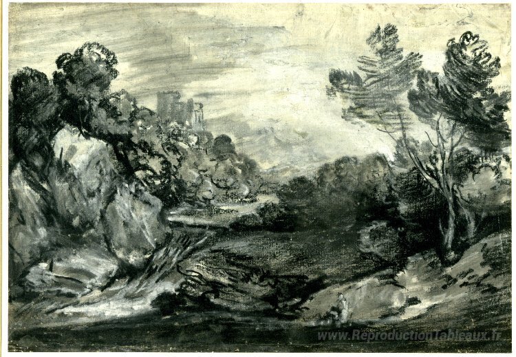 Nous vous proposons une reproduction artisanale sur toile du célèbre tableau 'Paysage boisé rocheux avec cascade, château et montagne,' de Thomas Gainsborough, provenant du Musée de la Reproduction.