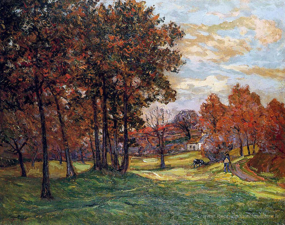 Nous vous proposons une reproduction artisanale sur toile du célèbre tableau 'Paysage d'automne à Goulazon' de Maxime Maufra, provenant du Musée de la Reproduction.