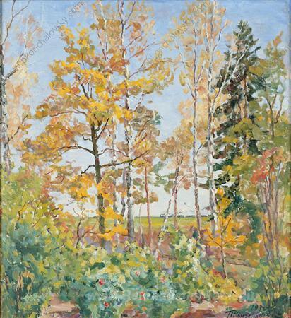 Nous vous proposons une reproduction artisanale sur toile du célèbre tableau 'Paysage d'automne avec train' de Pyotr Konchalovsky, provenant du Musée de la Reproduction.