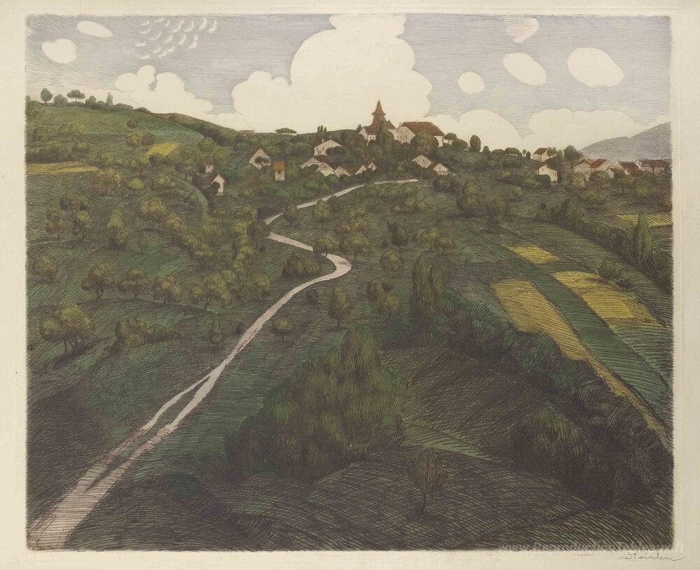 Nous vous proposons une reproduction artisanale sur toile du célèbre tableau 'Paysage de Belmont, près de Lausanne' de Theophile Steinlen, provenant du Musée de la Reproduction.