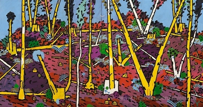 Nous vous proposons une reproduction artisanale sur toile du célèbre tableau 'Paysage de Cottlesbridge' de Dale Hickey, provenant du Musée de la Reproduction.