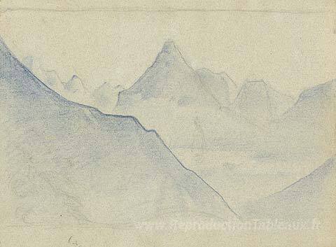 Nous vous proposons une reproduction artisanale sur toile du célèbre tableau 'Paysage des montagnes' de Nicholas Roerich, provenant du Musée de la Reproduction.