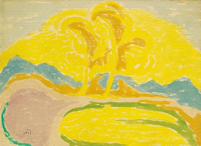 Nous vous proposons une reproduction artisanale sur toile du célèbre tableau 'Paysage jaune' de Janos Mattis-Teutsch, provenant du Musée de la Reproduction.