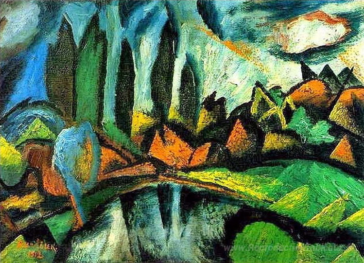 Nous vous proposons une reproduction artisanale sur toile du célèbre tableau 'Paysage' de David Burliuk, provenant du Musée de la Reproduction.