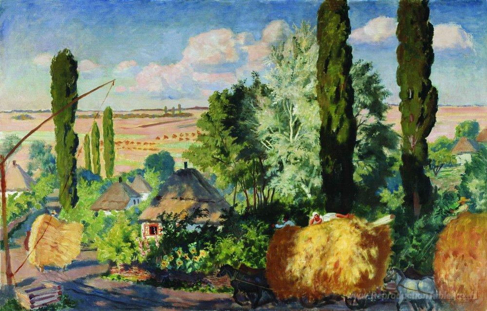 Nous vous proposons une reproduction artisanale sur toile du célèbre tableau 'Paysage ukrainien' de Boris Kustodiev, provenant du Musée de la Reproduction.