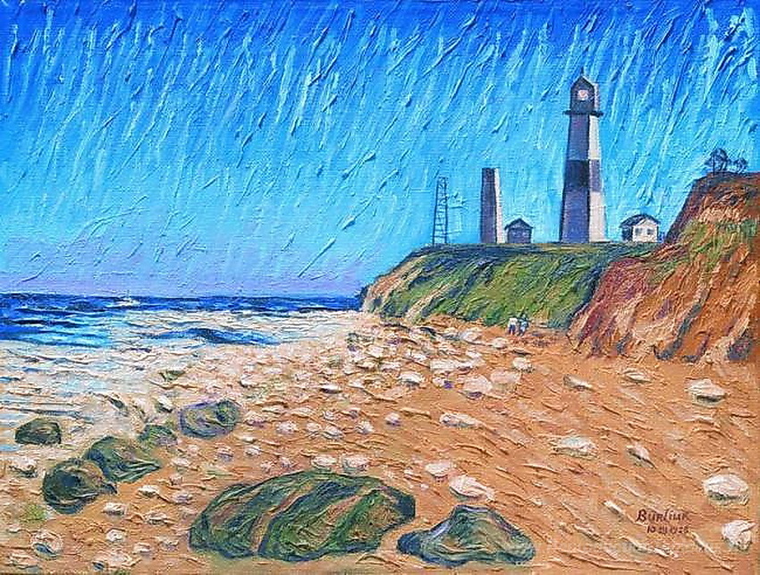 Nous vous proposons une reproduction artisanale sur toile du célèbre tableau 'Phare sur la côte' de David Burliuk, provenant du Musée de la Reproduction.